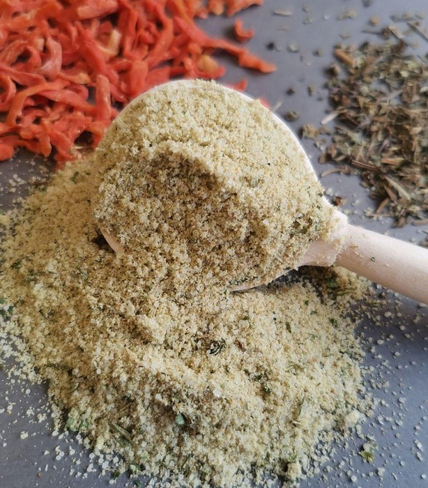 Состав: рыбный порошок, лук, шпинат, чеснок, перец красный острый, куркума, укроп, петрушка зелень, сахар, соль морская, соль пищевая, крахмал.