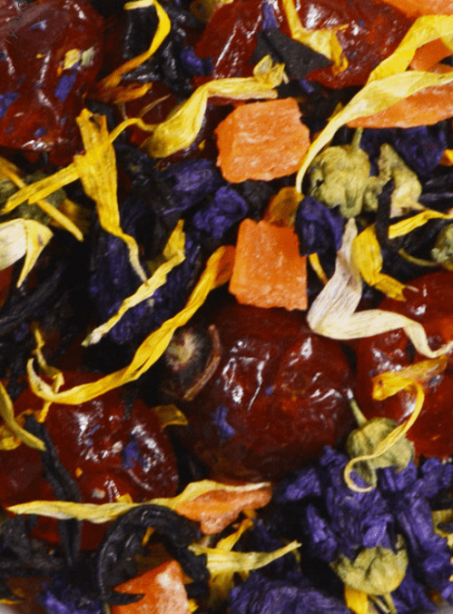 Купаж из классических черных индийских чаев с добавленем шиповника, вишни, цукатов, лепестки мальвы и календулы. Содержит пищевые ароматические масла.