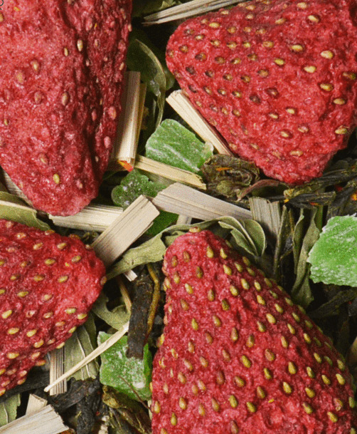 Купаж на основе традиционного китайского чая Сенча с добавлением кусочков сушеного яблока, лемонграсса, мяты, каркаде, сублимированной клубники. Содержит пищевые ароматические масла.