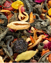 СОСТАВ: чай зеленый байховый ганпаудер, корень имбиря, цветки апельсинового дерева, лепестки розы, цукаты яблока, кардамон, вишня,. Содержит пищевые ароматические масла.