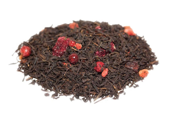 Черный крупнолистовой чай с ягодами барбариса, клубникой, клюквой, рябиной, красной смородиной и сладким карамельно-клубничным ароматом.