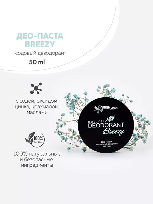 Натуральный содовый дезодорант для тела BREEZY эффективно защищает от пота и неприятного запаха, дарит ощущение свежести и комфорта на весь день.