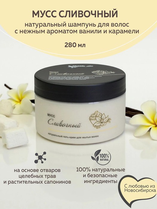Натуральный гель-крем для мытья волос МУСС СЛИВОЧНЫЙ создан по уникальной технологии на основе целебных трав и растительных сапонинов, с маслами, экстрактами ванили и целебных трав для питания, увлажнения и смягчения волос.