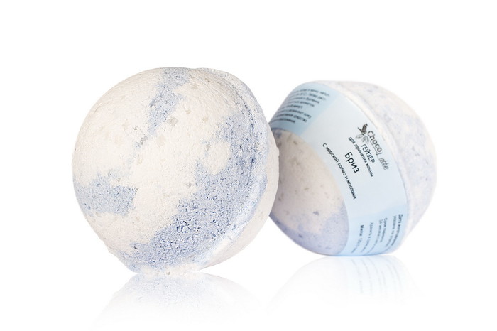 Бурлящий гейзер (шарик) БРИЗ для принятия ванны, растворяясь в теплой воде с шипением и бурлением, насыщает её морской солью, полезным оливковым маслом и свежим легким ароматом, с нотами грейпфрута, бергамота, лаванды, перца, кардамона, артемизии, ветивера, белого кедра и олибанума.