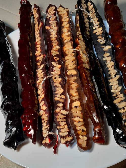 Армянская чурчхела из грецкого ореха. В составе оболочки: фруктовый сок (виноград, слива, инжир, гранат), мука пшеничная в/с, сахар, лимонная кислота, корица, гвоздика. Продаётся ассортиментом без деления на вкусы.  Индивидуальная вакуумная упаковка, масса нетто около 80 грамм.