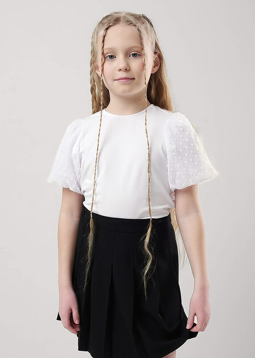 Стильная блузка станет отличным дополнением к вашему гардеробу! Модель выполнена из хлопкового полотна с добавлением эластана. Блузка с короткими пышными рукавами из шифона, она отлично подойдет для создания классных школьных образов!