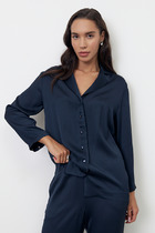 Блузка из вискозного трикотажного полотна джерси, свободного кроя. Втачной короткий рукав. Отложной воротник со стойкой, спереди цельнокроеная планка на пуговицах. Боковые разрезы, нашивка металл.