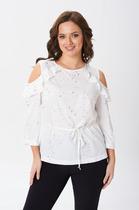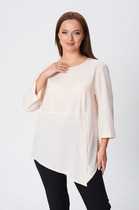 Блузка из вискозного трикотажного полотна джерси, свободного кроя. Втачной короткий рукав. Отложной воротник со стойкой, спереди цельнокроеная планка на пуговицах. Боковые разрезы, нашивка металл.