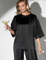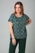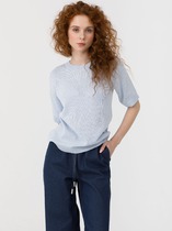 Джемпер свободного кроя из фактурного трикотажного полотна джерси. Спущенная линия плеча, короткий рукав, по низу рукава вышивка. V-образная горловина с широкой обтачкой, внизу изделия нашивка дерево. По спинке средний шов.