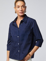 Блузка среднего объема из текстильного полотна штапель, отложной воротник со стойкой. Цельнокроеная планка с застежкой на пуговицы. Втачной длинный рукав с притачным манжетом и застежкой на пуговицы. Низ прямой, по бокам разрезы.