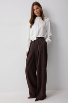 Брюки широкие из трикотажного поливискозного полотна джерси. По талии пояс на внутренней резинке. Спереди имитация гульфика. Боковые карманы с отрезным бочком. Боковые шлицы, по низу изделия потайной стежок.