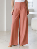 Брюки прямые,широкие из тканого полотна лен с вискозой. По талии притачной пояс на внутренней резинке, в поясе шнур из основной ткани. Боковые карманы в отрезном бочке.