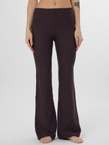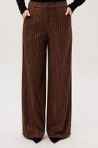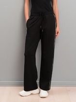 Брюки прямые из плотного трикотажного полотна. По талии притачной пояс с застежкой на пуговицу, по спинке пояс на резинке. По переду карманы в листочку с декоративной тесьмой.