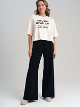 Брюки зауженные из текстильного полотна с добавлением вискозы габардин. Притачной пояс со шлевками, гульфиком и застежкой на молнию, крючок. Боковые карманы с отрезным бочком. По спинке пояс на резинке. Заутюженые стрелки.