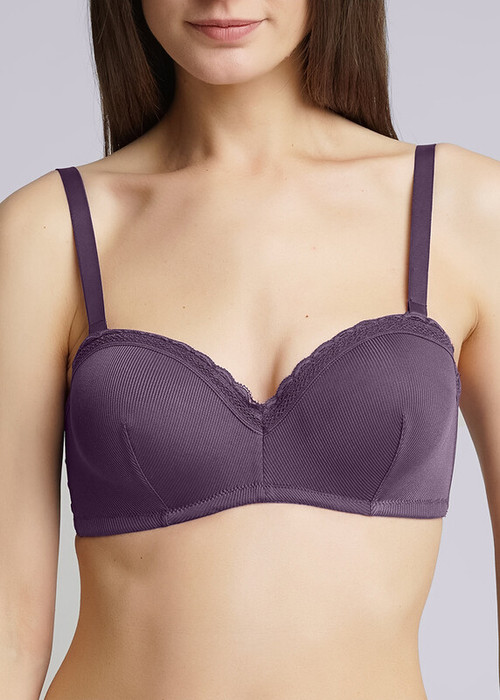 Бюстгалтер с формованной чашкой без push-up, со съемными бретелями и силиконовой лентой с внутренней стороны пояса бюстгалтера. По верху чашки модель декорирвана кружевом.