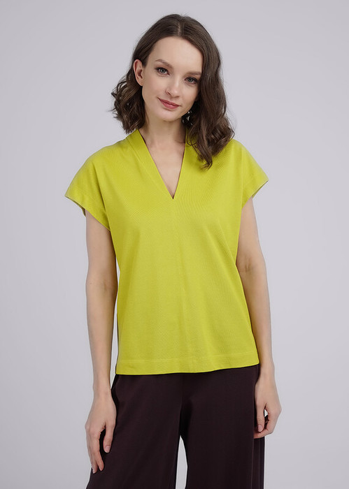 Джемпер прямого силуэта из трикотажного полотна пике. V-образная горловина, по горловине обтачка. По переду отстроченный средний шов. Короткий цельнокроеный рукав. Произвоство Турция.