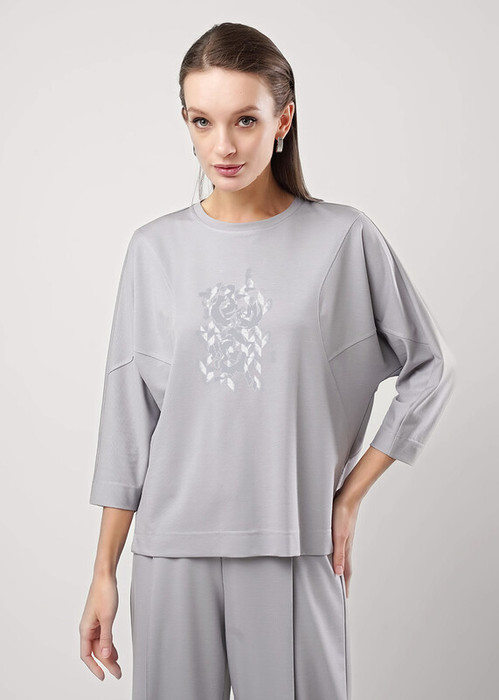 Джемпер свободного кроя из вискозного трикотажного полотна. Округлая горловина с обтачкой. Цельнокроеный рукав длиной 3/4. По переду и спинке отстроченные резы. По спинке средний шов. По бокам небольшие разрезы. Спереди принт фольга.