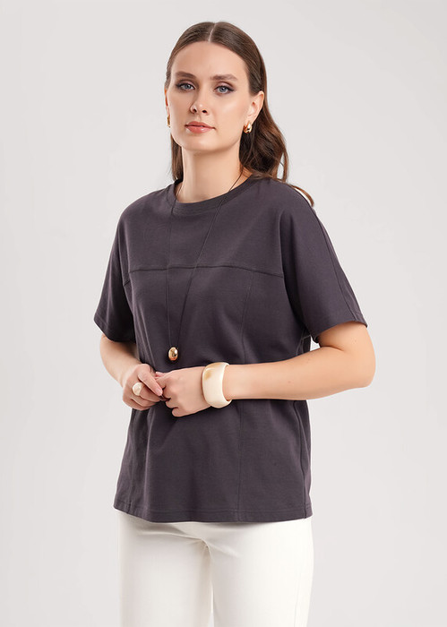 Джемпер прямого кроя из эластичного хлопкового полотна. Короткий цельнокроеный рукав. Округлая горловина с обтачкой. По спинке и по переду декоративные резы с затилом.