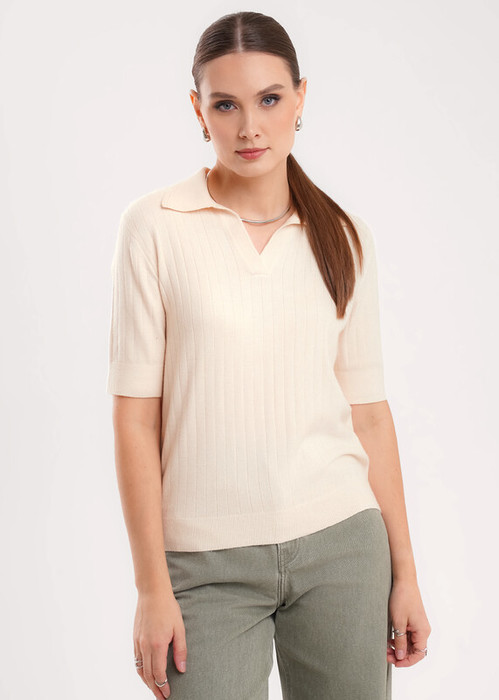 Вязаный джемпер прямого силуэта вискозной пряжи с добавлением нейлона. Основное переплетение разбор. Короткий втачной рукав. По горловине отложной воротник с планкой. По низу изделия и рукавов манжеты.