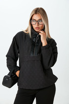 Джемпер спортивный из трикотажного полотна футер, свободного кроя. Округлая горловина с обтачкой. По переду резы с разрезами. Длинный рукав реглан, внизу нашивка. По низу рукава и изделия манжеты. Спереди принт.