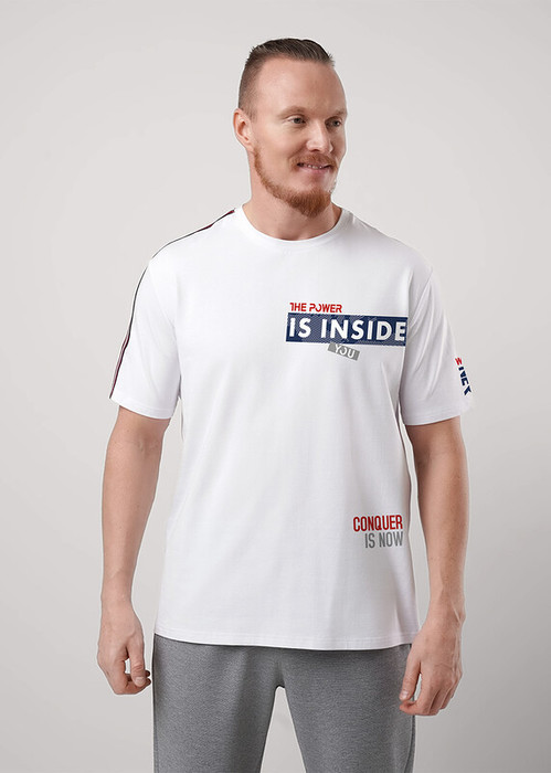 Интересная футболка из дышащего полотна с большим содержанием хлопка. Модель выглядит интереснее благодаря тесьме по рукаву и дизайнерскому текстовому принту спереди. Отличный вариант для образа в спортивном стиле.