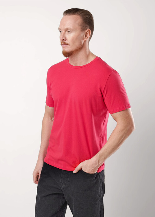 Базовая однотонная футболка стандартного объема с круглой горловиной, втачным рукавом из хлопкового полотна с добавлением эластана. Является неотъемлемой частью мужского гардероба.