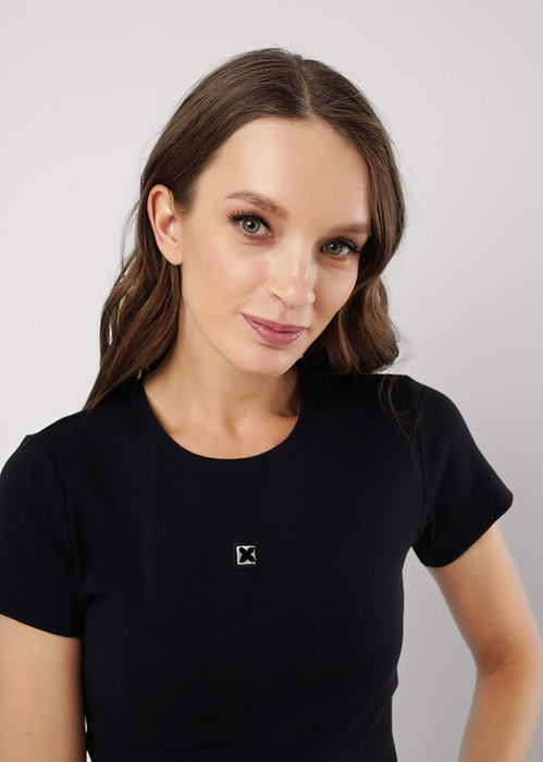 Футболка укороченная, прилегающего силуэта из хлопкового трикотажного полотна с эластаном- рибана. Округлый вырез горловины с окантовкой. Короткий втачной рукав. Спереди нашивка.
