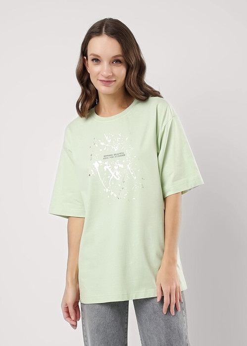 Футболка оверсайз свободного кроя из хлопкового трикотажного полотна. Слегка спущенный короткий рукав. Округлая горловина с обтачкой из рибаны. По спинке средний шов. Спереди принт с фольгой.