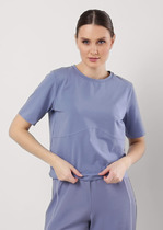 Джемпер прямого силуэта из вискозного трикотажного полотна пике. Короткий цельнокроеный рукав, спереди декоративные отстроченные резы. Округлая горловина с внутренней обтачкой. На спинке средний шов. Спереди нашивка металл.