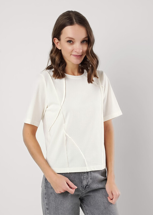 Футболка из трикотажного полотна пике, прямого кроя. Округлая горловина с обтачкой. Короткий втачной рукав. По переду и спинке декоративные резы, швами наружу обработанные на оверлоке.