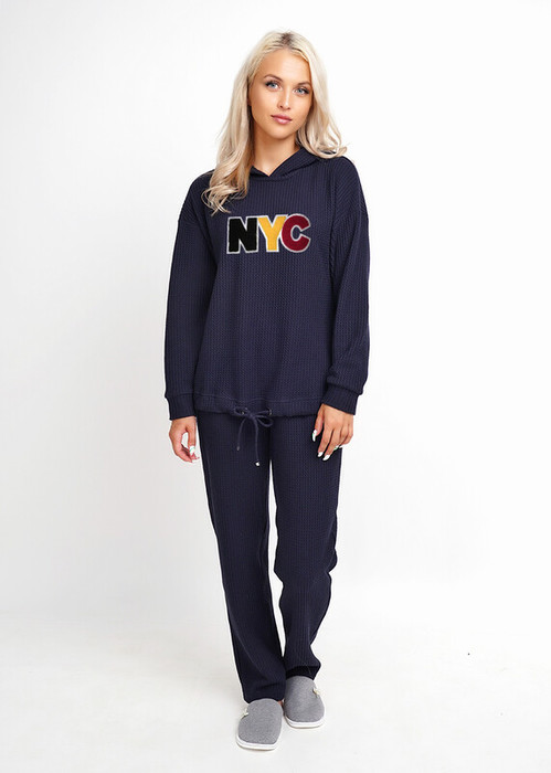 Комплект из фактурного полотна ""вафли"" с начёсом. Джемпер с капюшоном, длинным рукавом на манжете и кулисой понизу. Спереди объёмная нашивка. NYC- New York. Брюки прямые с карманами.