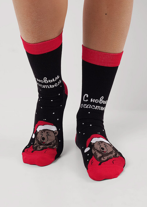 носки мужские с выделенным мыском, пяткой, бортом, с рисунком медведя и надписью с новым счастьем