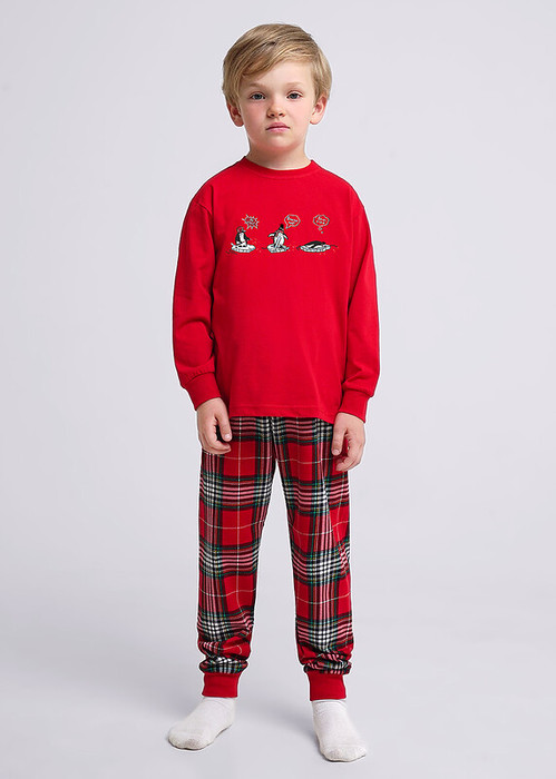Новогодняя пижама для мальчика, состоящая из джемпера и брюк. Джемпер с оригинальным принтом имеет обработку из эластичного трикотажа по линии горловины, низу рукавов. Брюки умеренного объёма выполнены из хлопкового полотна в клетку.