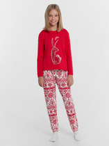Новогодняя хлопковая пижама из джемпера и брюк. Горловина , манжеты по низу рукава и брюк из эластичного полотна. Лонгслив свободного кроя со спущенным плечом и крутым принтом.Брюки среднего объема, эластичный пояс обеспечит комфорт и идеальную посадку.