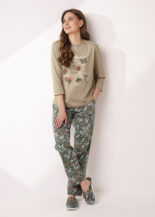 Набор одежды из хлопкового трикотажного полотна.Фуфайка прямого кроя,втачной рукав длиной 7/8, внизу манжет с отворотом,закрепкой.Спереди принт.Брюки по талии пояс на внутренней резинке с атласной лентой.Боковые карманы с отрезным бочком.Внизу брюк кант.