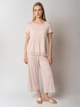 Пижама для дома и отдыха из трикотажного полотна с добавление модала.Футболка прямого кроя, короткий цельнокроенный рукав.Округлая горловина с обтачкой. Спереди принт,нашивка металл. Шорты с поясом на внутренней резинке.Боковые карманы с отрезным бочком.