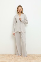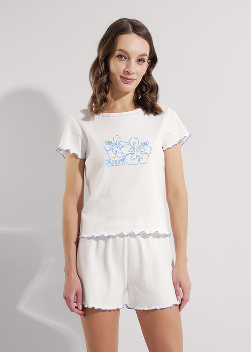 Пижама для дома и отдыха из трикотажного полотна кашкорсе. Футболка прямого кроя, короткий втачной рукав, округлая горловина с обтачкой, принт. По горловине контрастный застил. Шорты прямые с внутренней резинкой. По низу футболки и шорт мелкий оверлок.