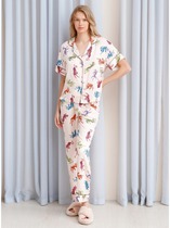 Набор одежды для дома и отдыха. Футболка из трикотажного полотна, горловина с обтачкой.Короткий втачной рукав. Спереди принт,нашивка. По низу рукава и изделия застилы. Брюки из штапеля, на резинке и шнуром из окантовки. Боковые карманы с отрезным бочком.