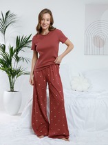 Набор одежды из хлопкового трикотажного полотна с модалом. Футболка прямого кроя. Короткий спущенный рукав. По горловине обтачка с кружевом. Спереди нашивка, сзади принт. Брюки прямые с поясом на внутренней резинке. По боковым швам узкое кружево, 2 ряда.