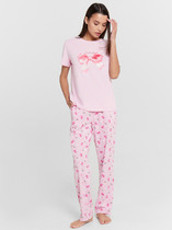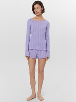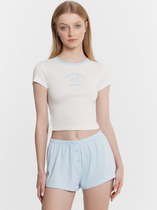 Пижама для дома из трикотажного полотна кашкорсе лапша. Майка укороченная. Узкая бретель. Округлый вырез горловины. По горловине и пройме окантовка.Спереди нашивка. По низу внутренняя резинка. Шорты прямого кроя, пояс на внутренней резинке, нашивка.
