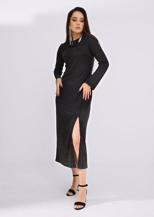 Платье макси по фигуре из трикотажного полотна с блеском. Круглый вырез горловины. Длинный втачной рукав по низу с разрезом. По спинке средний шов и застежка на пуговицу. По переду разрез от середины бедра.