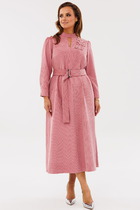 Платье из эластичного хлопкового футера 2х нитки. Длинный втачной рукав. Воротник стойка и планка с застежкой на пуговицы выполнены из кашкорсе. По низу изделия разрезы.