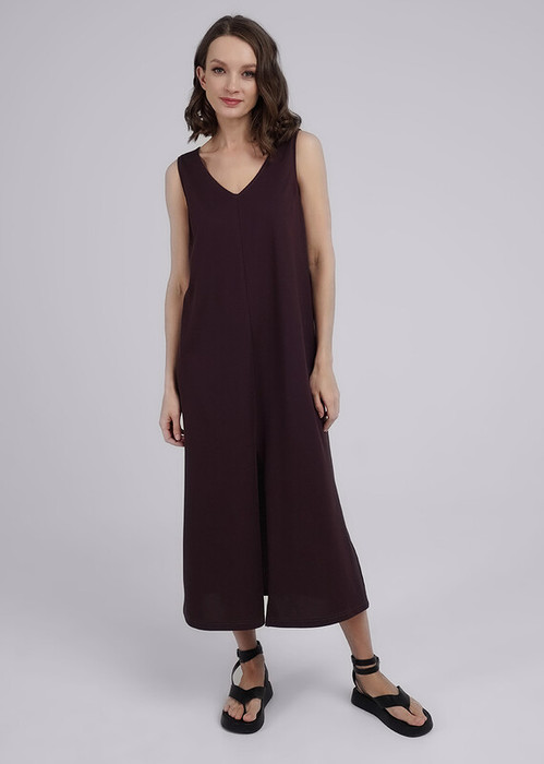 Платье длинное из трикотажного полотна пике, без рукавов слегка расклешенное книзу. V-образный вырез горловины. По горловине и пройме обтачка. По переду средний шов с разрезом.