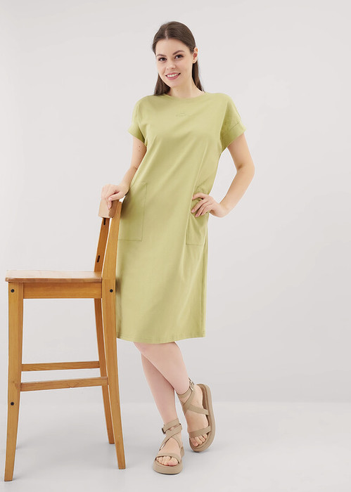 Платье для дома и одыха из хлопкового трикотажного полотна. Короткий цельнокроеный рукав, по низу рукава широкий манжет. Округлая горловина с обтачкой. Накладные карманы. На спинке кокетка. Спереди термонашивка.