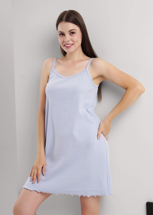Сорочка ночная А-образного силуэта из трикотажного полотна кашкорсе лапша. Длиной чуть ниже колена, на узких бретелях. По горловине и пройме окантовка. По низу изделия мелкий оверлок.