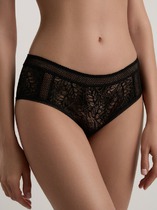 Бикини комфортной посадки. На детали переда - симметричные кружевные вставки. По ножке и талии - резинка с фестоном. На детали переда - небольшой атласный бант.