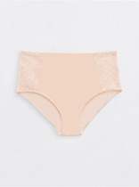Бикини из однотонного хлопкового полотна. На детали переда по бокам расположены симметричные кружевные вставки. По ножкам обработаны резинкой с фестоном, по поясу - атласной резинкой. Спереди по центру - небольшой бант.