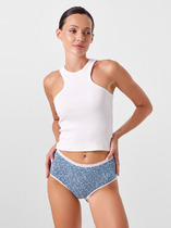 Модель бразилиана на хлопковом полотне с добавлением эластана. На детали переда - симметричные кружевные вставки, переходящие на деталь спинки. По талии - обработка резинкой. Завершает дизайн небольшой бант на детали переда.
