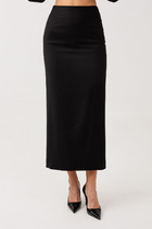 Юбка миди прямого силуэта из трикотажного полотна рибана с вискозой. По талии притачной пояс на внутренней резинке. На детали переда вертикальный защип. На спинке средний шов, внизу разрез.