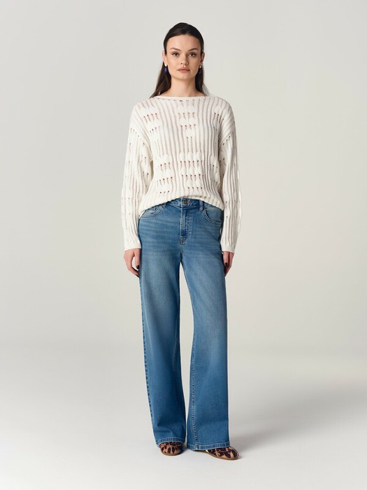 Джинсы wide leg из eco-friendly денима – универсальная модель, которая идеально сочетается как с повседневной одеждой, так и с яркими образами. Благодаря широкому крою брюк и удобной посадке, модель не сковывает движения и вытягивает силуэт.
